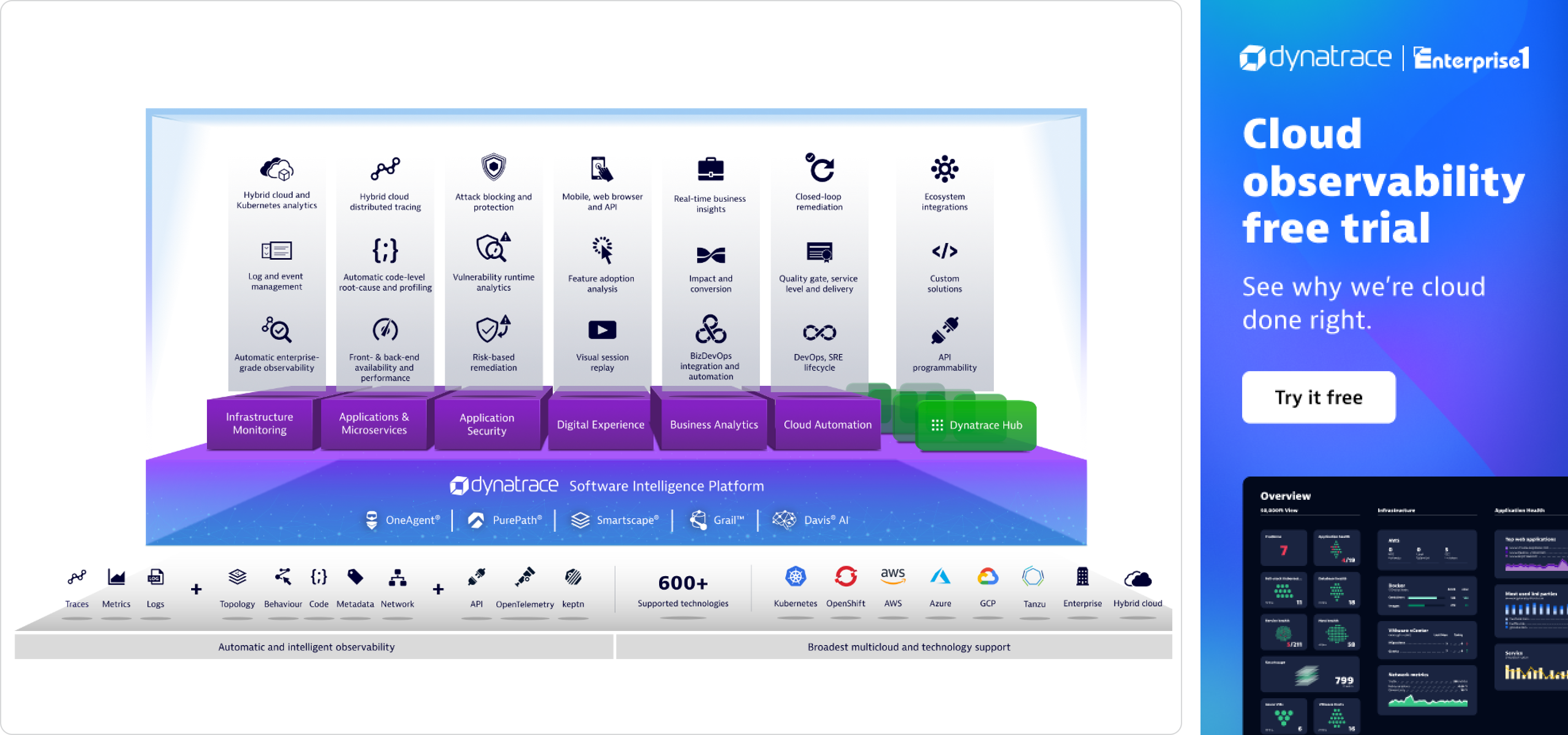 자동 풀 스택 계측으로 모든 트랜잭션에 대해 정확성과 상호 의존성을 파악하며 클라우드 인프라 모니터링 및 AIOps가 포함되어 전체 스택에서
